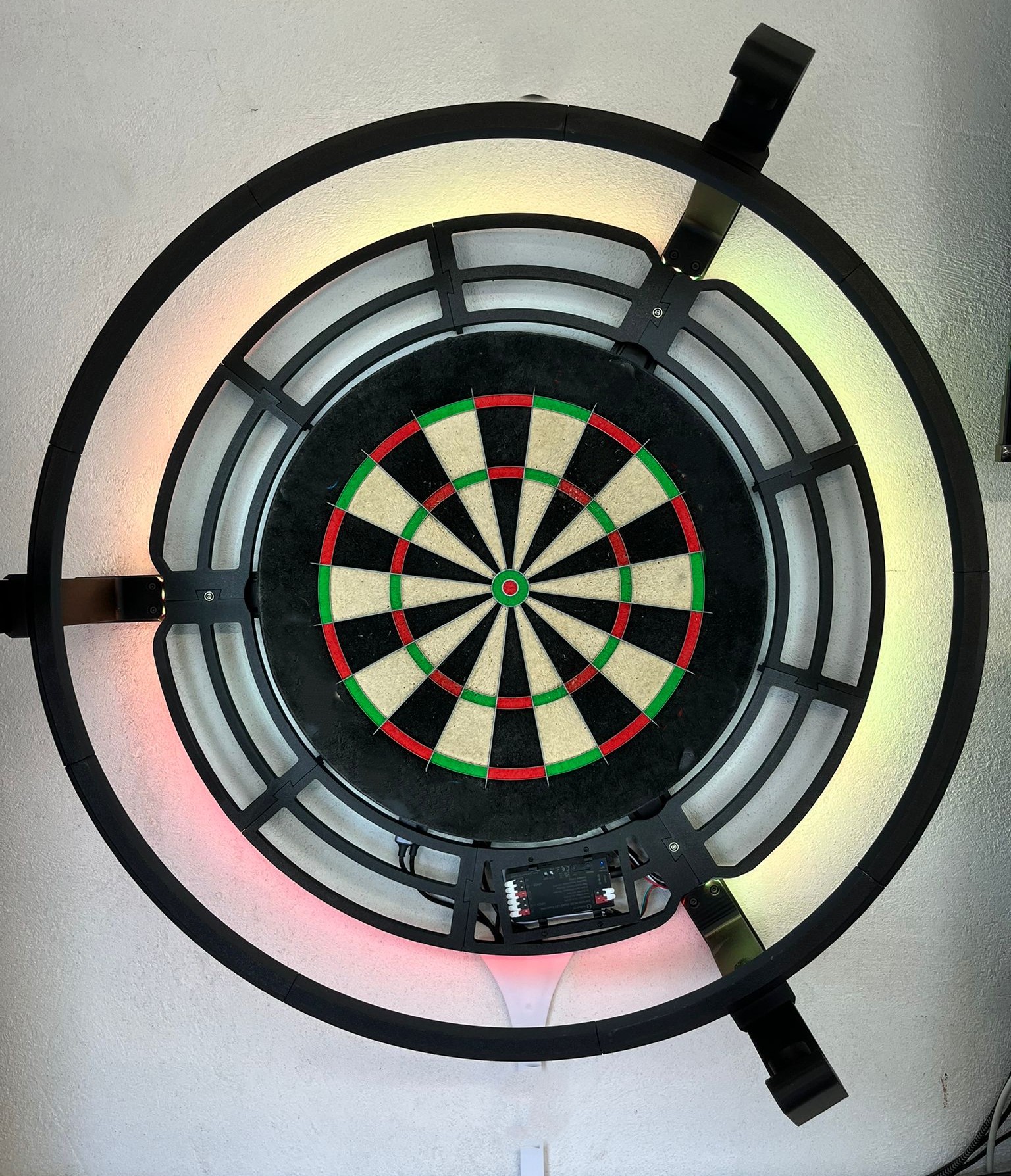 Mit dieser Erweiterung kannst du dein Dart-Setup um eine moderne LED-Steuerung erweitern. In Kombination mit WLED entstehen beeindruckende Lichteffekte und eine verbesserte Sicht auf das Board – perfekt für Training, Spieleabende oder ein professionelles Dart-Ambiente zuhause.